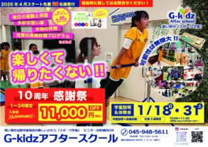 センター南 2025.12.16 学童説明会&体験会について 2026年度スタート入会受付中! (2025年度スタートもOKです!) *2026年度... センター南 2025.11.20 「大人教室」開講のお知らせ なんと、大人向けレッスンの開講が決定しました! 今回開講するのは「書道」「珠算」の2つ! G-kid... センター南 2025.11.19 本物体験のお知らせ 「人間の体ってどうなっているの?」 そんな不思議に答えます! 医師・医学博士の杉本真樹先生による、最... センター南 2025.11.3 サッカースクール開講のお知らせ \元Jリーガーに学べる!/ サッカースクールを11月12日(水)から開講いたします!! 止める、蹴る... センター南 2025.10.19 サッカーイベントのご案内! このたび、子どもたちにサッカーを 楽しんでもらえるイベントを開催いたします!! 体を動かしながら仲間... センター南 2025.10.19 ハロウィンイベントのご案内! 今年もやって参りました! G-kidzハロウィンイベントです(^^♪ 今回は仮装コンテストやゲームを... 1 2 3 … 8 次へ »
