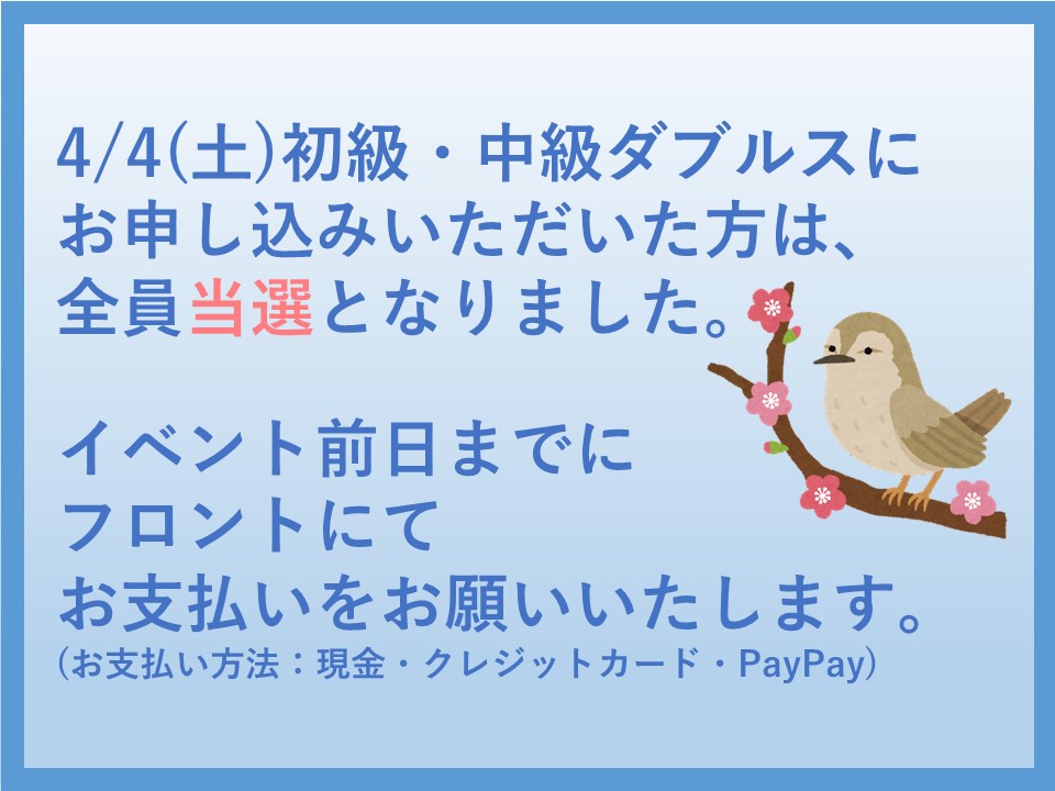 4/4(土)開催『初級・中級ダブルス』抽選結果のご案内