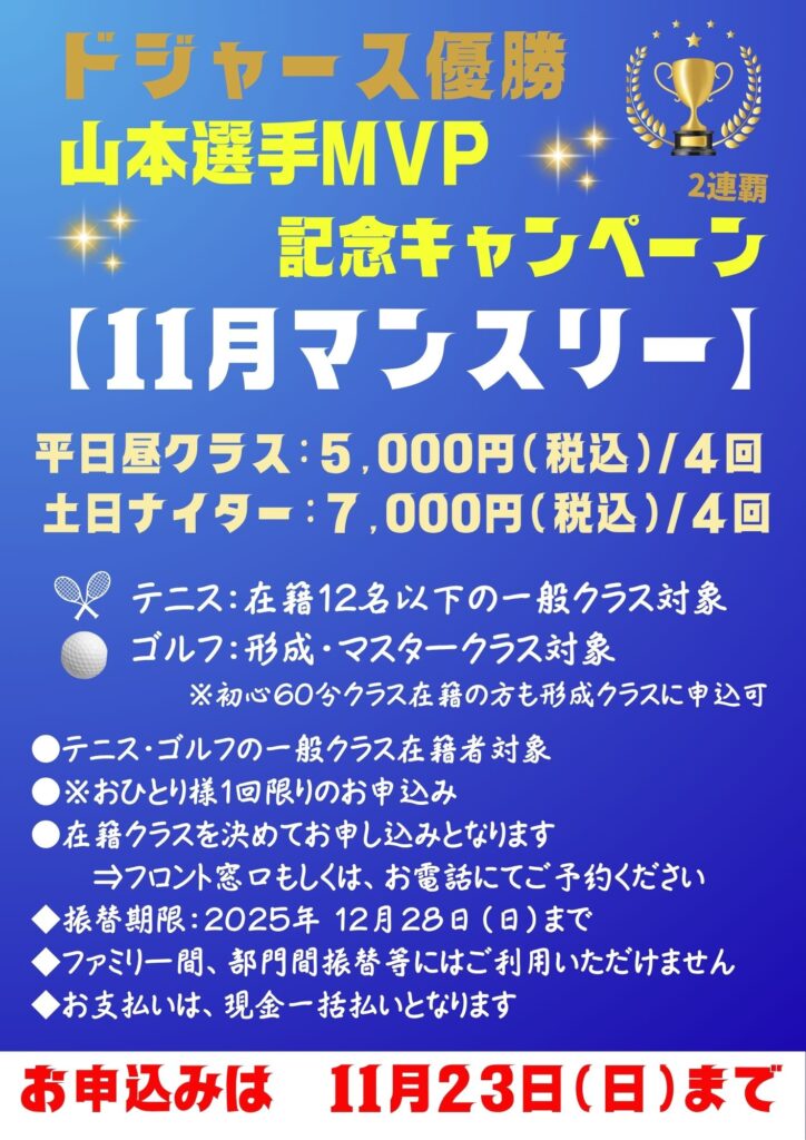 ドジャース優勝記念11月マンスリーのお知らせ