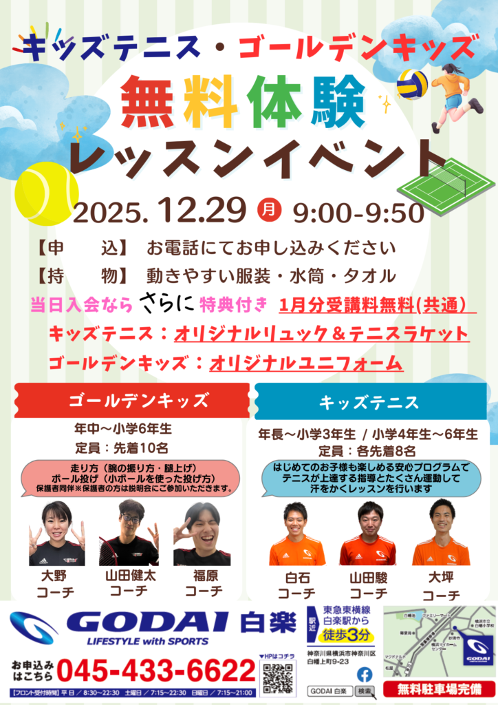 12/29(月)キッズテニス・ゴールデンキッズ無料体験レッスンイベント