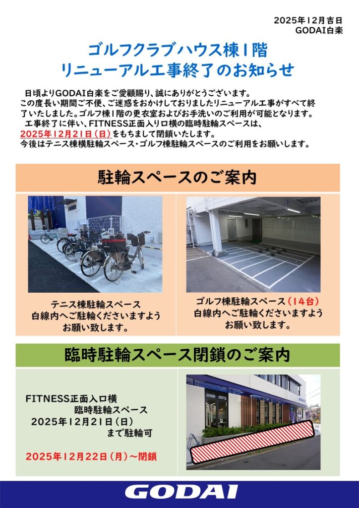 ゴルフクラブハウス棟1階リニューアル工事終了のお知らせ