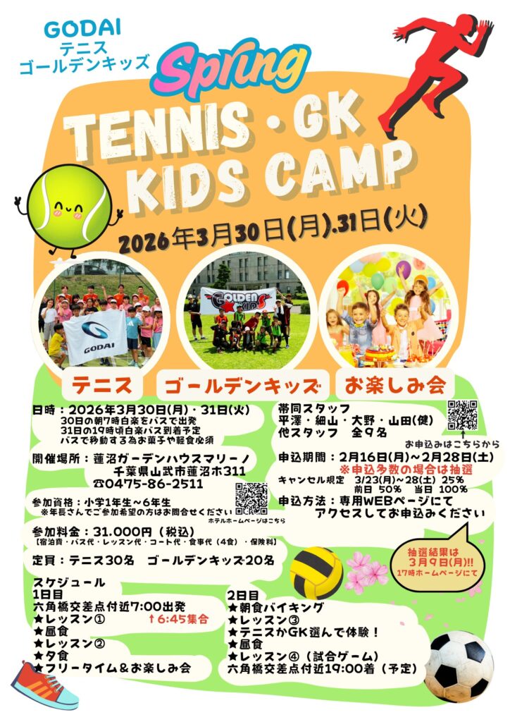 3/30(月)・31(火)テニス・GKキッズキャンプのお知らせ
