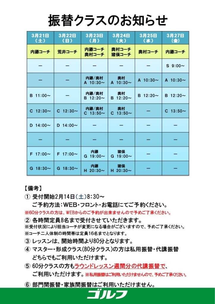(ゴルフ)3月振替クラスご案内