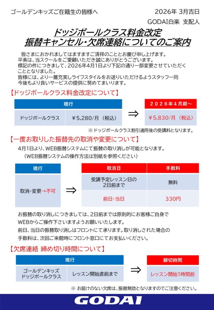 ドッジボールクラス料金改定・振替キャンセル・欠席連絡についてのご案内