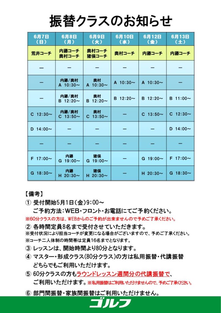 ゴルフ2026年6月振替クラスご案内