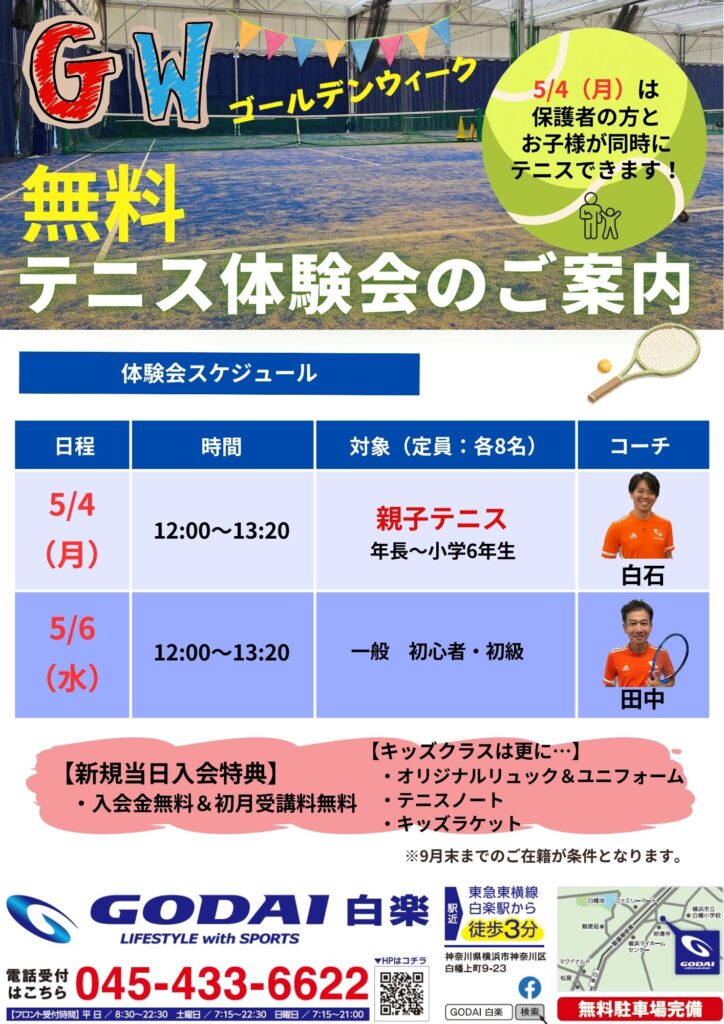5/4(月)親子テニス・5/6(水)初心者・初級テニス体験会