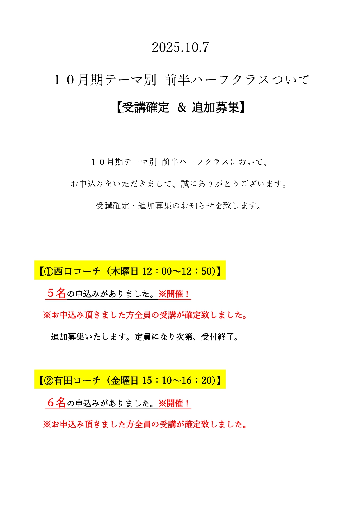 【10月期 テーマ別 前半ハーフクラス】受講確定&追加募集
