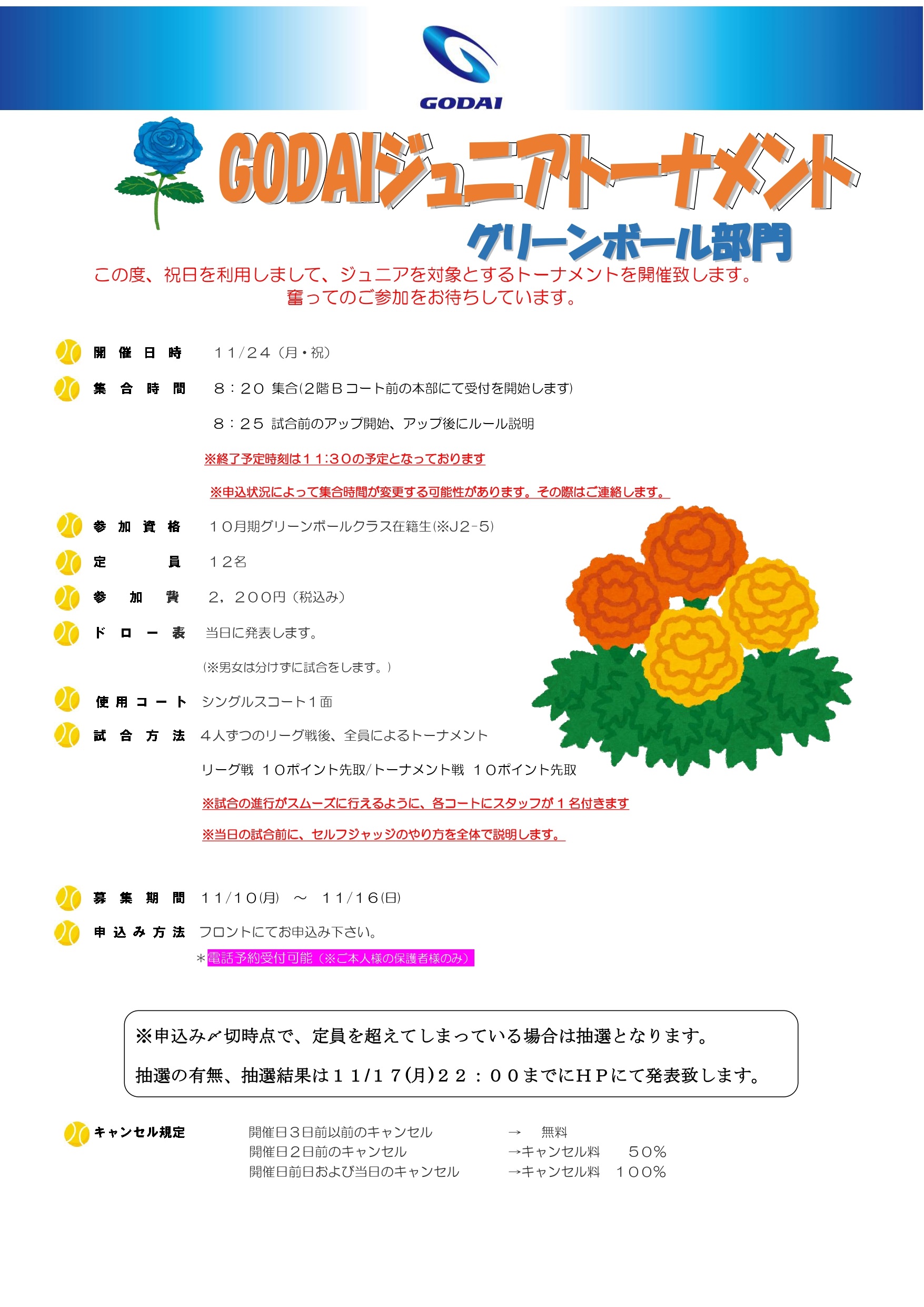【11/24(月・祝)】ジュニアトーナメントのお知らせ ※グリーンボールの部