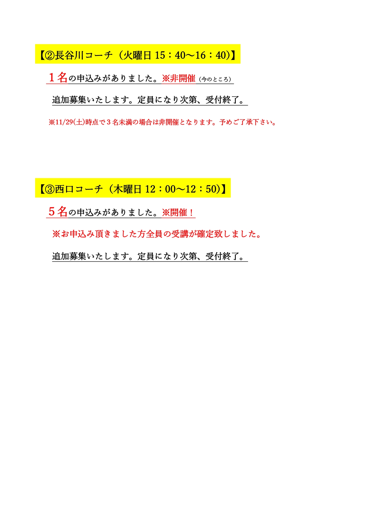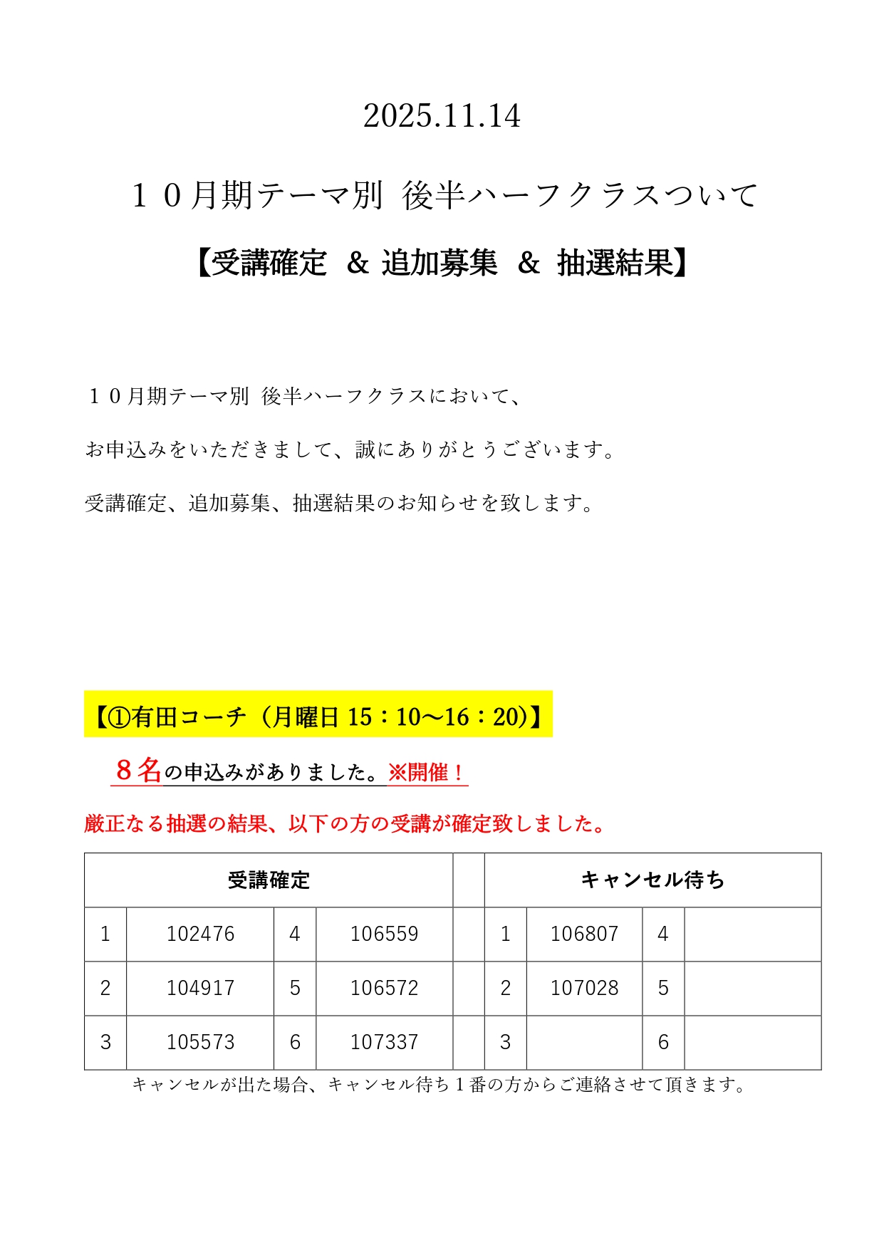 【10月期 テーマ別 後半ハーフクラス】受講確定&追加募集&抽選結果 発表