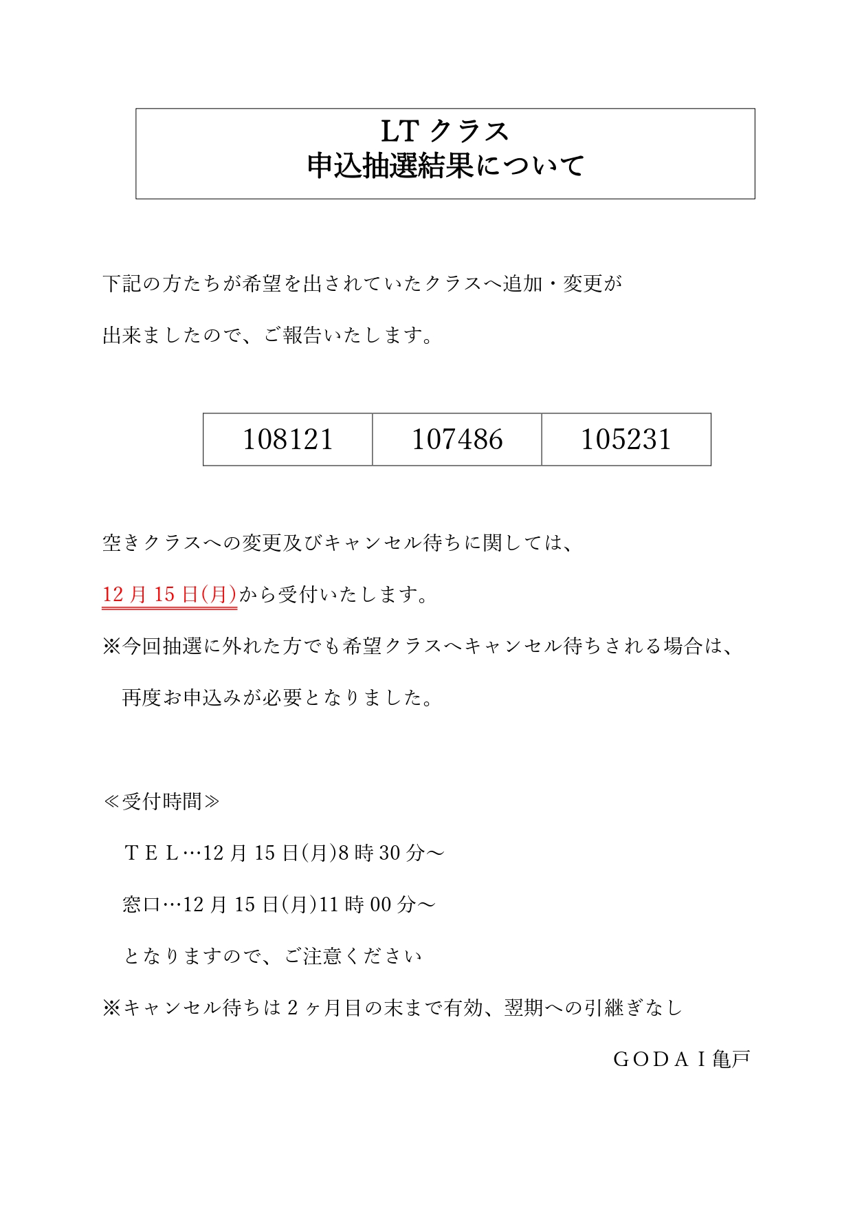 40期(2026年1月期)LTクラス抽選結果