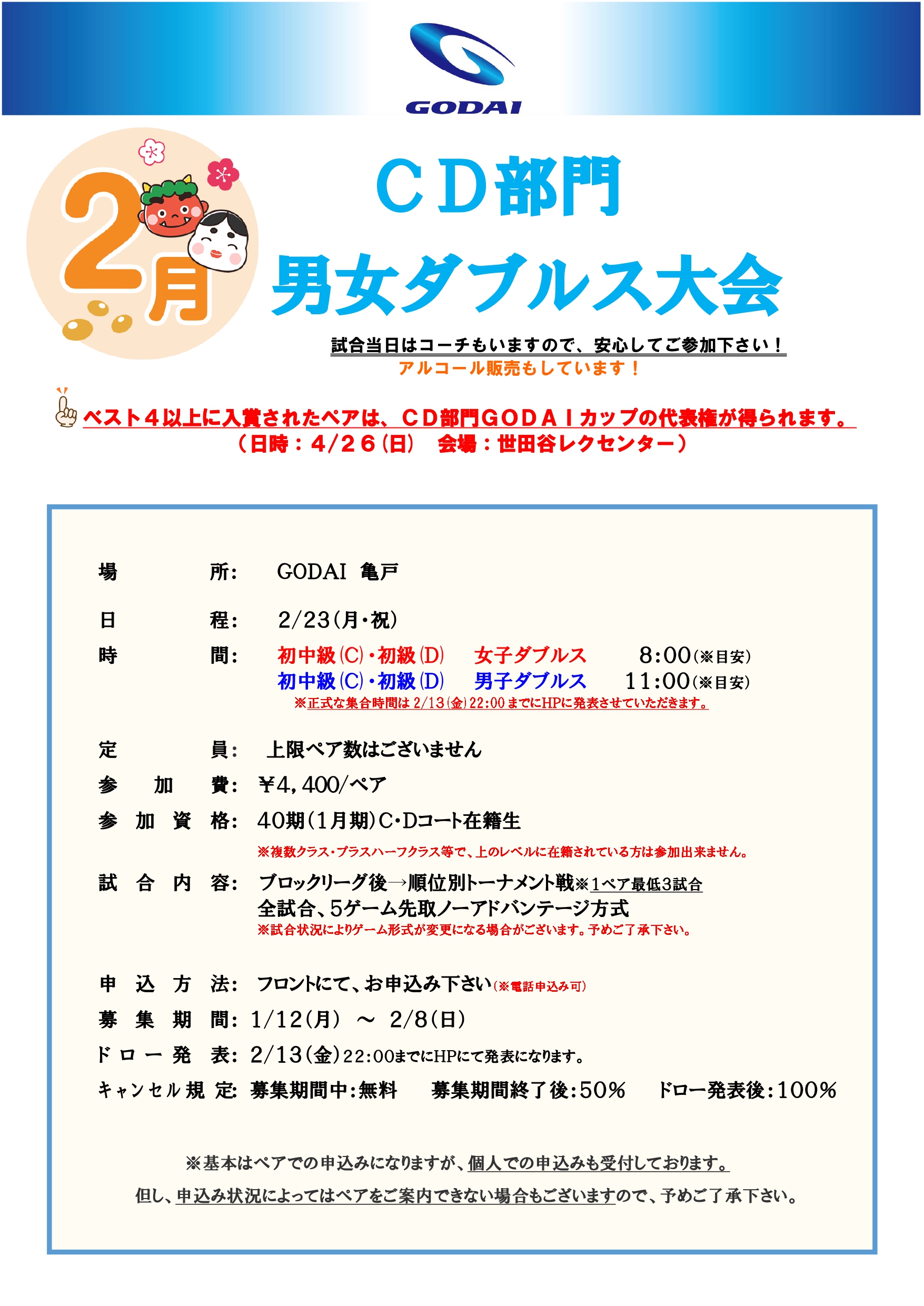 • 2/23(月)CD部門男女ダブルス大会のお知らせ