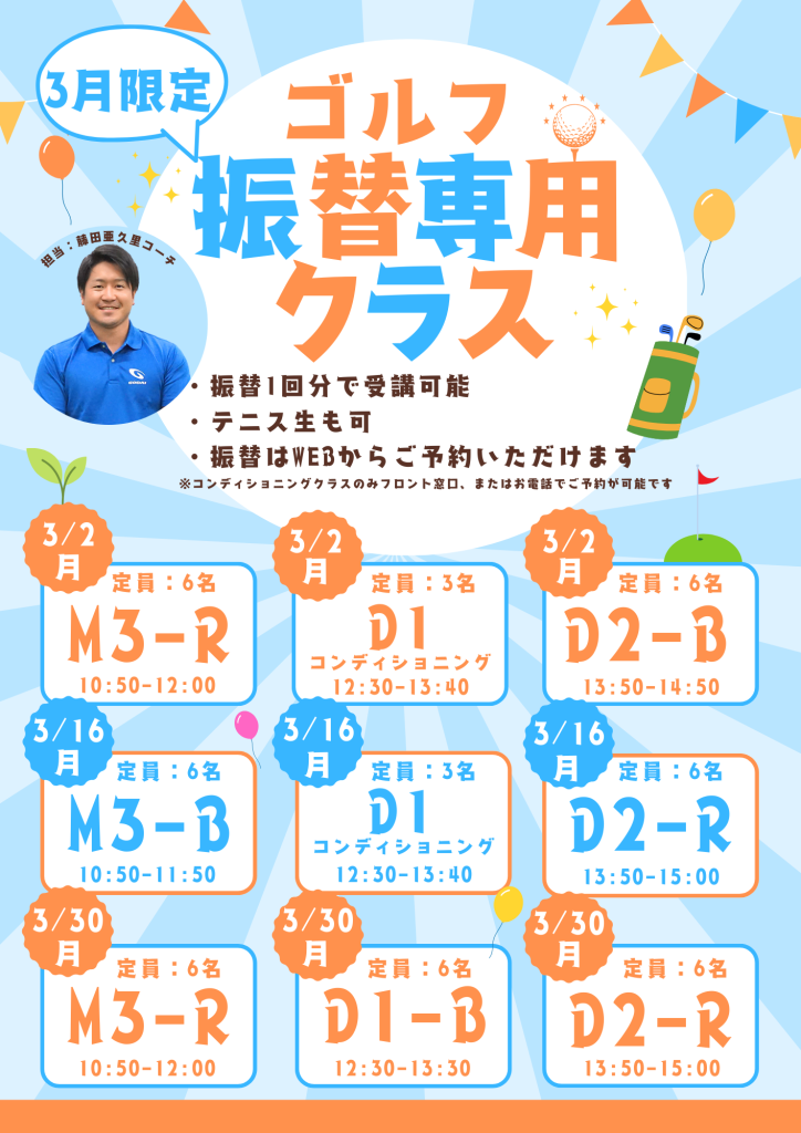 ●ゴルフ振替専用クラスと●ゴルフ×コンディショニングの特別クラスをご用意しております。 ※振替専用クラスはWEBより、コンディショニングクラスはフロント窓口かお電話でのご予約となります。 ※3/30(月)は全てゴルフ振替専用クラスとなります。