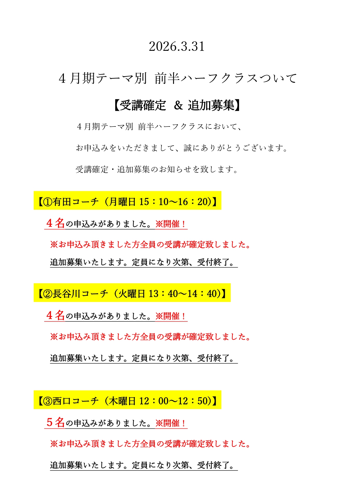 【4月期 テーマ別 前半ハーフクラス】受講確定 & 追加募集