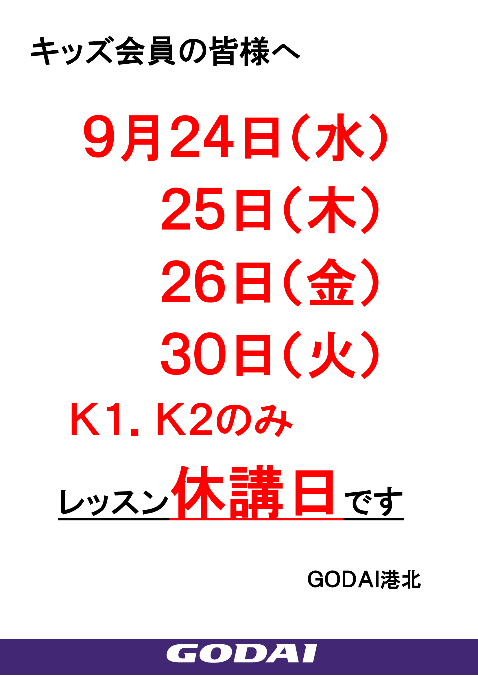 9月24日(水),25日(木),26日(金),30日(火) K1・K2のみ休講のお知らせ