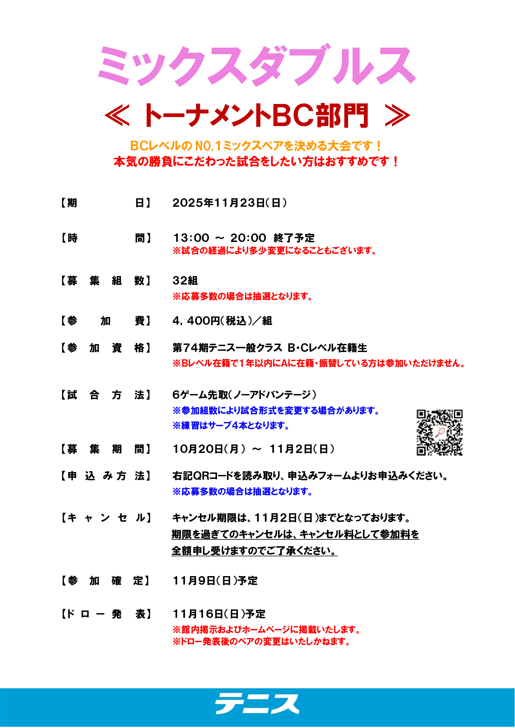 11/23(日) ミックスダブルス〈トーナメントBC部門〉開催!