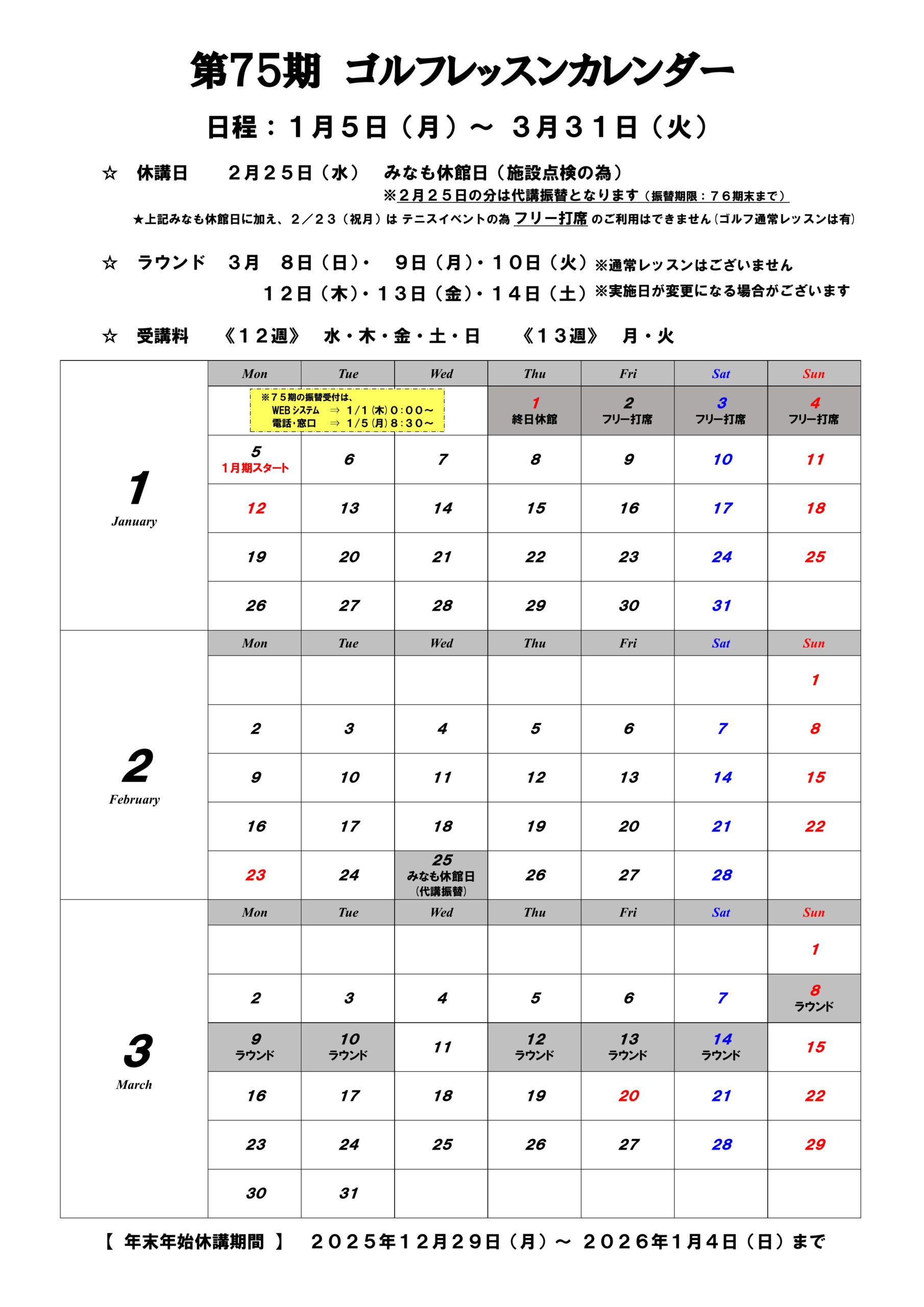 ゴルフ 第75期(1・2・3月)のお知らせ