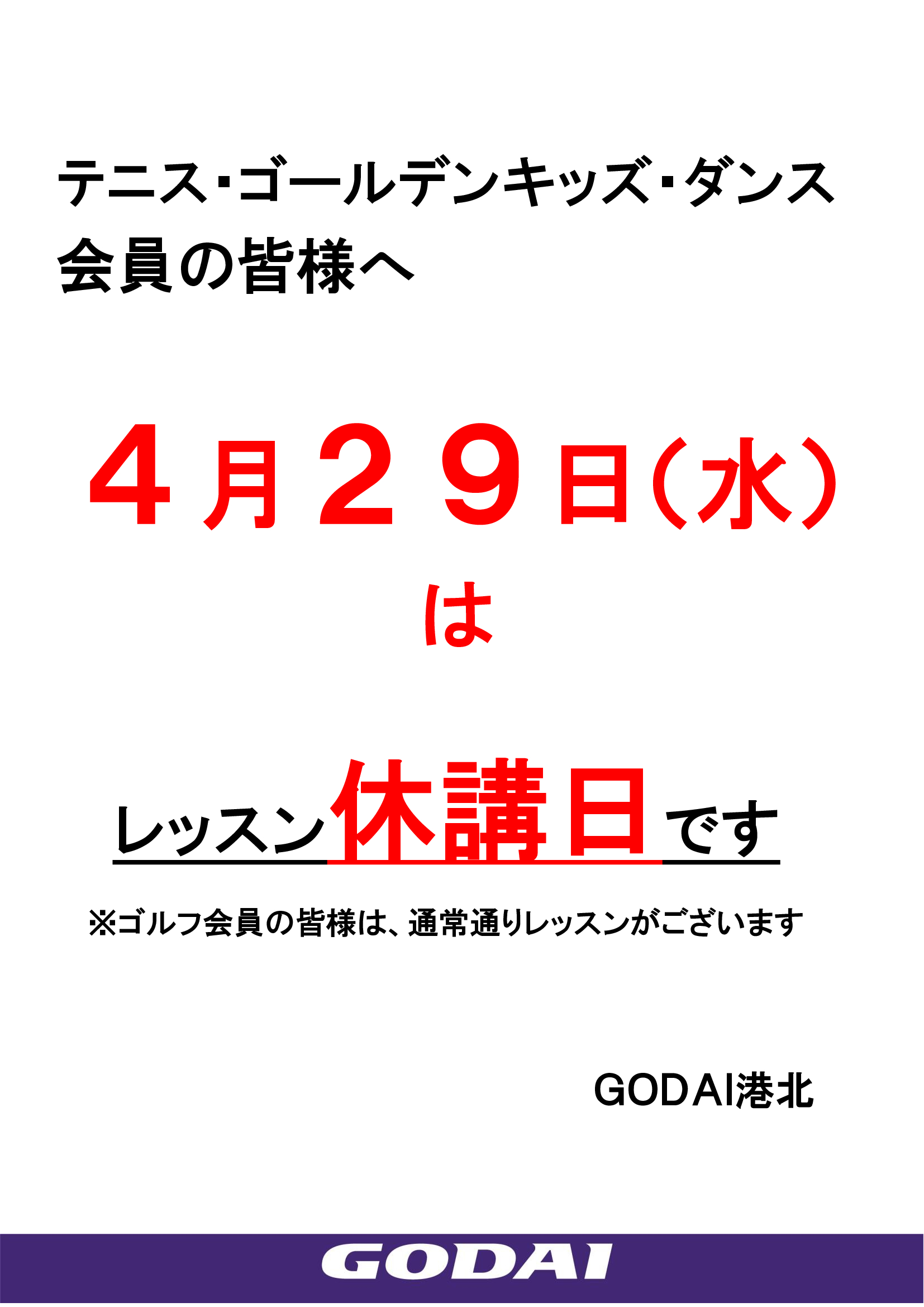 4月29日(祝・水)休講日のお知らせ